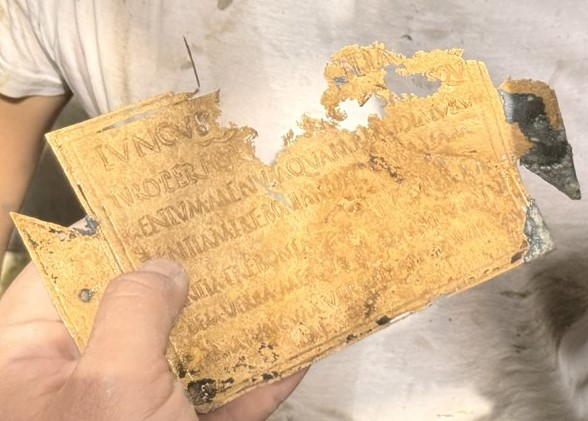 Tra tutti questi reperti, ha attirato la mia attenzione e curiosità una lamina in oro biansata, rinvenuta nella Vasca sacra negli ultimi giorni dello scavo del 2024, che riporta un giuramento molto particolare tra due coniugi. Il testo inciso è il seguente: