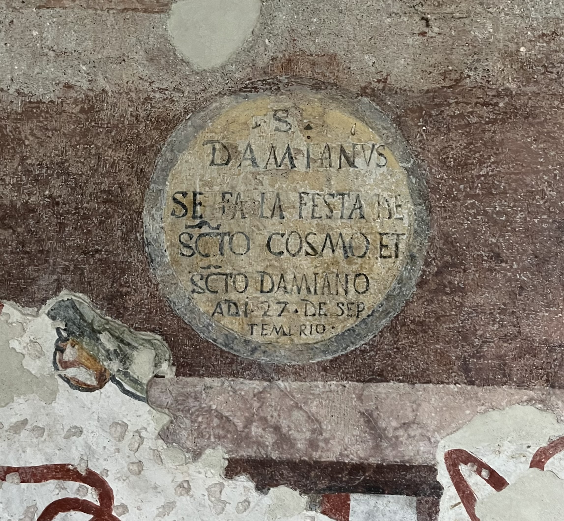 Epigrafe deliziosamente plurilinguistica: c’è un po’ di dialetto (se fa la festa de), un po’ di latino (S. Damianus) e un po’ di italiano impreciso (adì). Cosma e Damiano sono due santi medici spesso nominati insieme: poiché non si facevano pagare ebbero l’epiteto di anargyroi (senza denaro, dal greco); da notare la forma italianizzata Cosmo, al posto della forma più corretta Cosma.